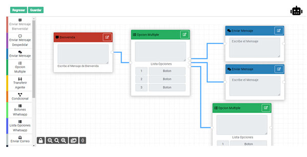 Diseñe su propio chatbot sobre una herramienta gráfica amigable y predecible que le permitirá automatizar sus procesos, integrar información de sus bases de datos y realizar ajustes de forma ilimitada .